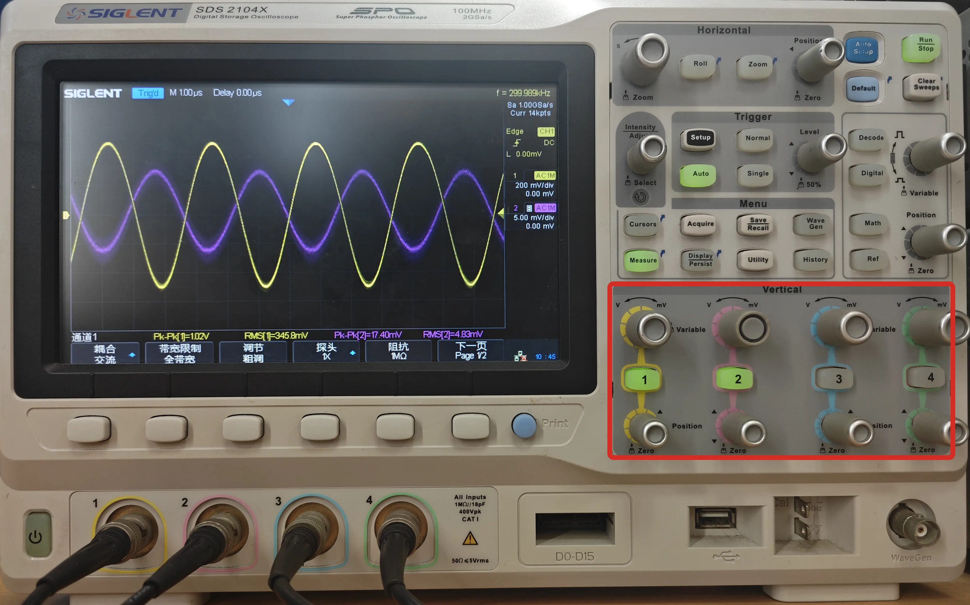 - 垂直调整的旋钮在示波器的右侧,分别对应 4 个通道,可以直接调整对应通道的垂直方向的状态。