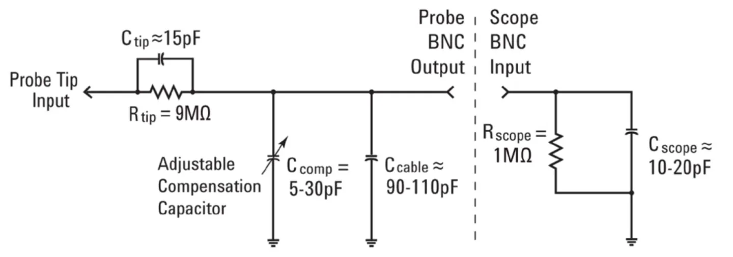 示波器专用探头往往并联了一个补偿电容 \(C_{comp}\),可以通过螺丝刀进行调节,以保证 10:1 的分压比。理想情况下,可以通过以下公式导出补偿电容: