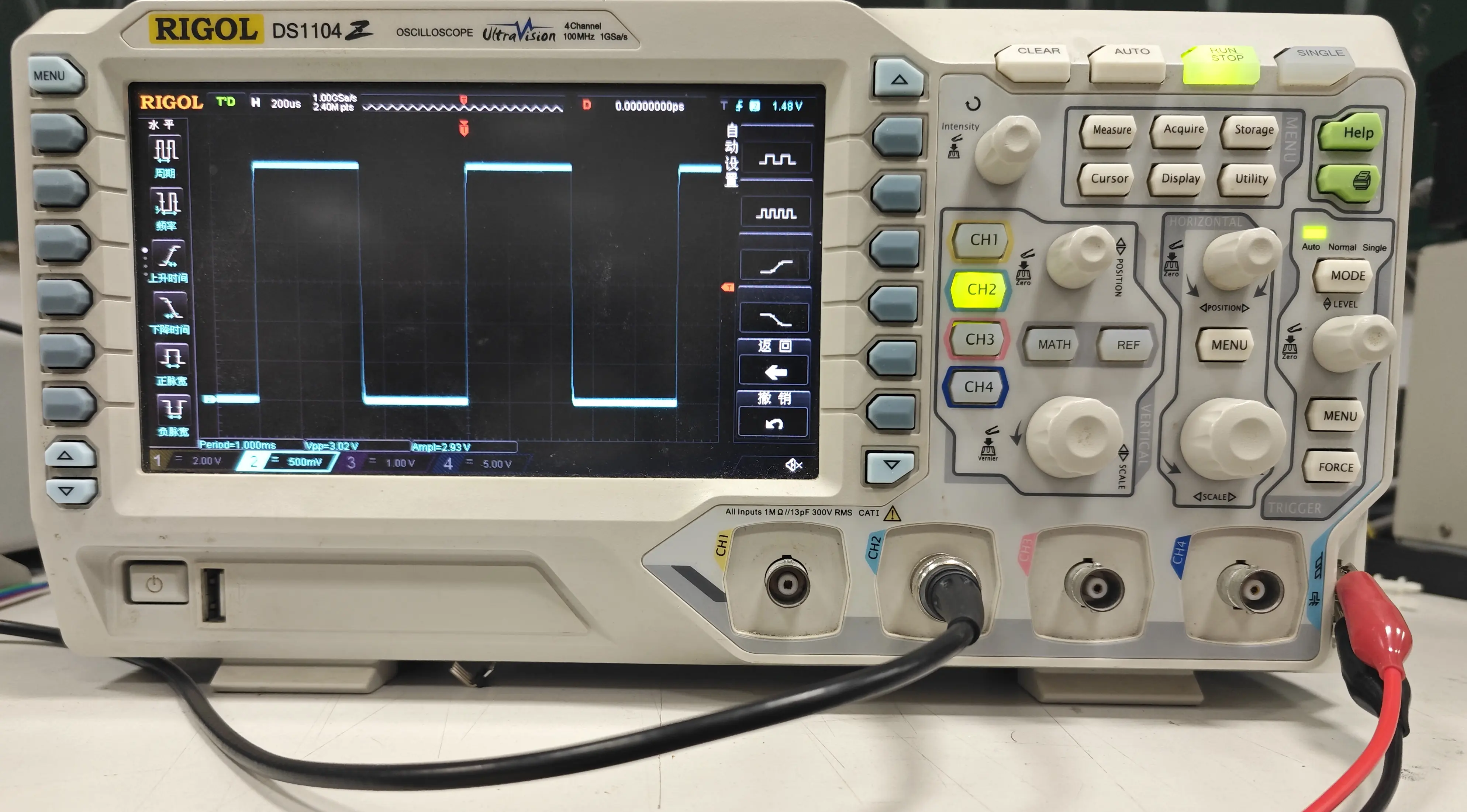 示波器右侧有两个金属接头,输出一组测试用的方波信号,我们首先将探头连接到测试信号上,然后使用 AUTO 显示出方波。