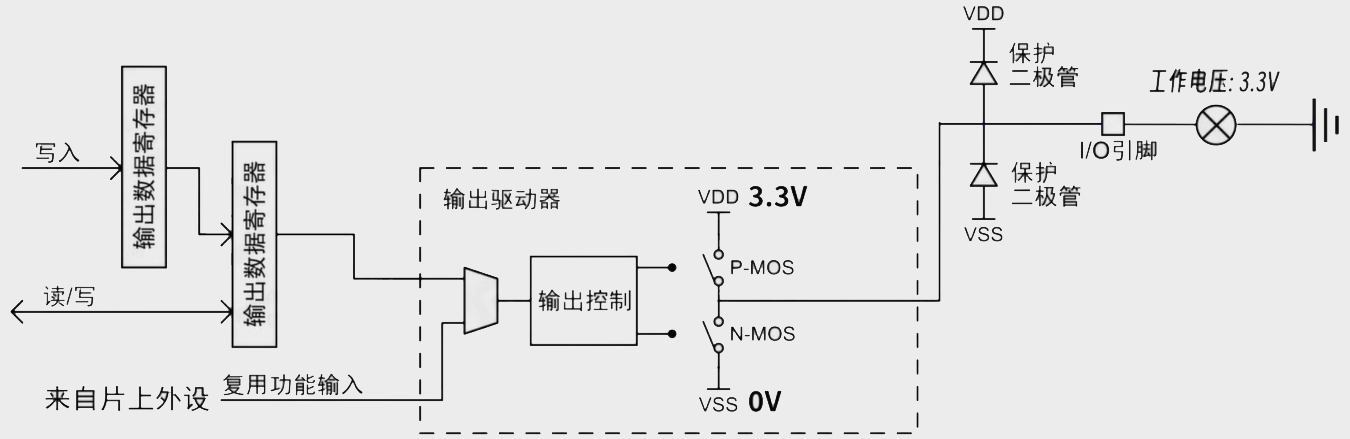当配置为开漏输出(Open-drain Output)时,单片机可以输出 LOW 或 HiZ。(P-MOS 永远处于截止状态,排除输出引脚本身,可以认为 N-MOS 的漏极是开路,故称为开漏)
