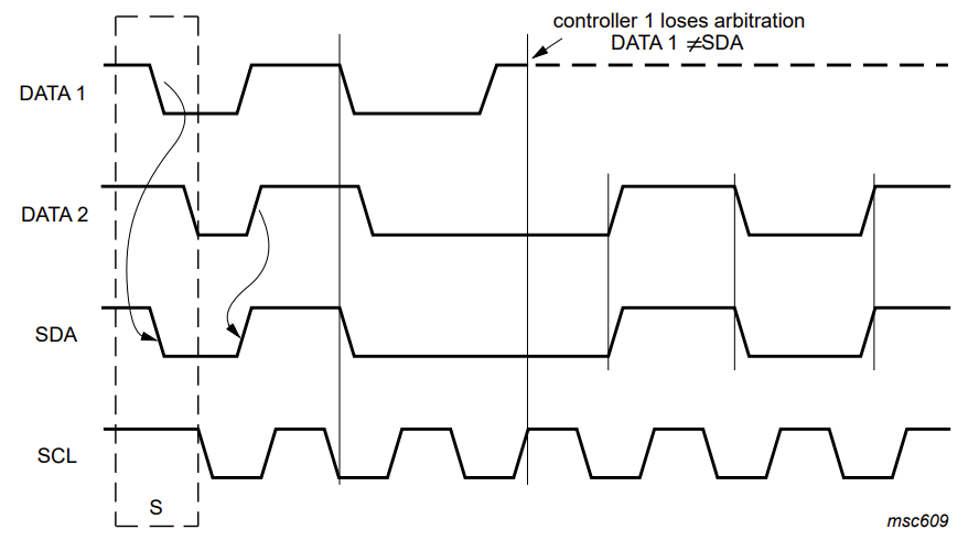 由于线与特性,SCL 仅当所有主机都将 SCL 线拉高时,才能输出高电平,否则 SCL 线为低电平。这使得多个节点同时发送时钟信号时,在总线上表现出统一的时钟信号。