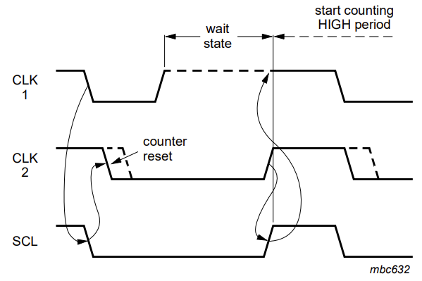 当 A、B 主机先后拉低 SCL 线后,先拉低 SCL 线的主机 A 会先试图拉高 SCL 线。由于线与特性,SCL 仍然保持低电平,此时 A 将进入等待状态,直到 B 释放 SCL 线,完成时钟同步。
