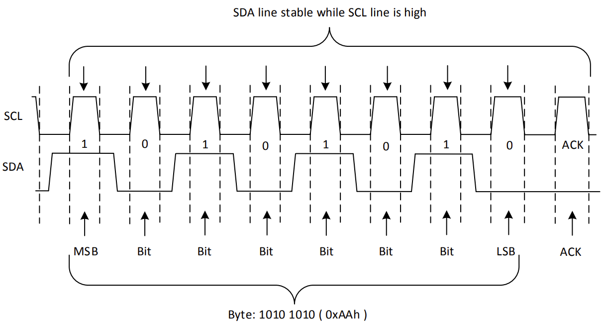 在传输数据的环节,每个字节会使用 9 个时钟周期,前 8 个时钟周期用于确定数据的时序,第 9 个周期用于检测应答信号。