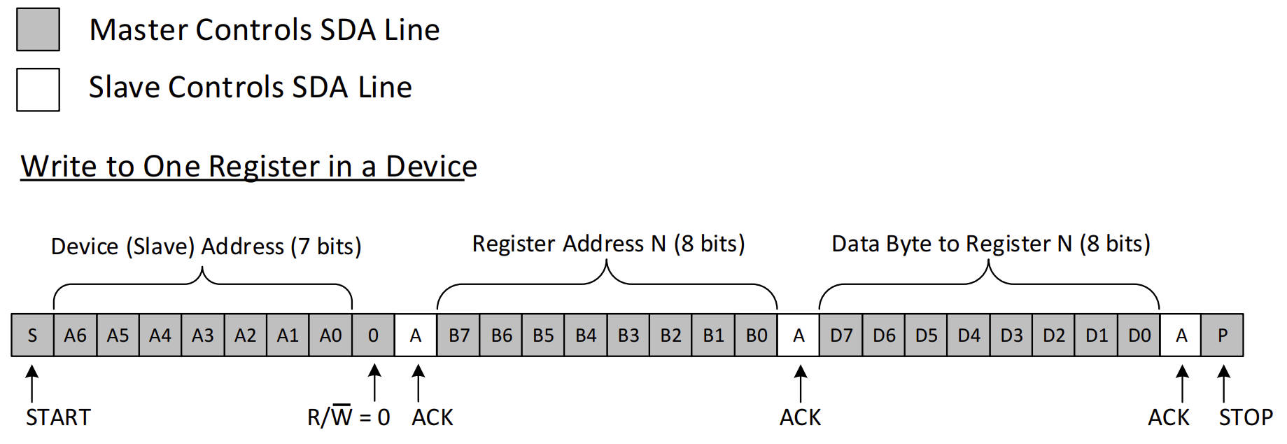 写入从机寄存器:先发送从机地址和寄存器地址,再紧跟着发送数据。数据以 MSB 优先的方式传输。
