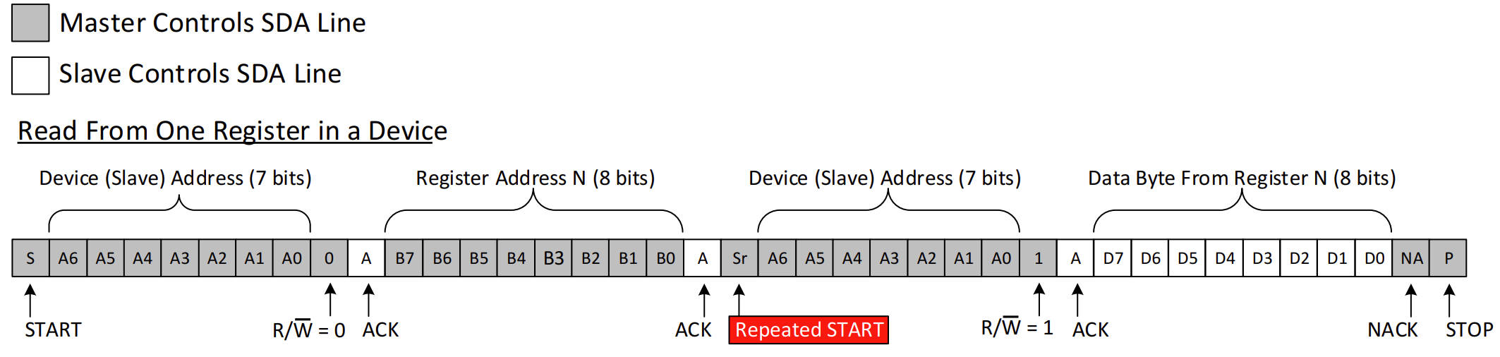读取从机寄存器:先通过发送模式传输数据(从机地址和寄存器地址),再进入接收模式接收数据。数据以 MSB 优先的方式传输。