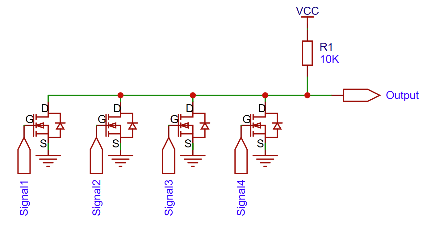 当多个开漏模式引脚相连时,整个线路的电平状态取决于这些引脚的输出状态。只有在所有引脚均输出高阻态时,线路上的高电平才由外部上拉电阻提供,此时的电压等于上拉电阻连接的电源电压。反之,如果任一引脚输出低电平,整条线路就会被拉至接地电位,即 0 伏。