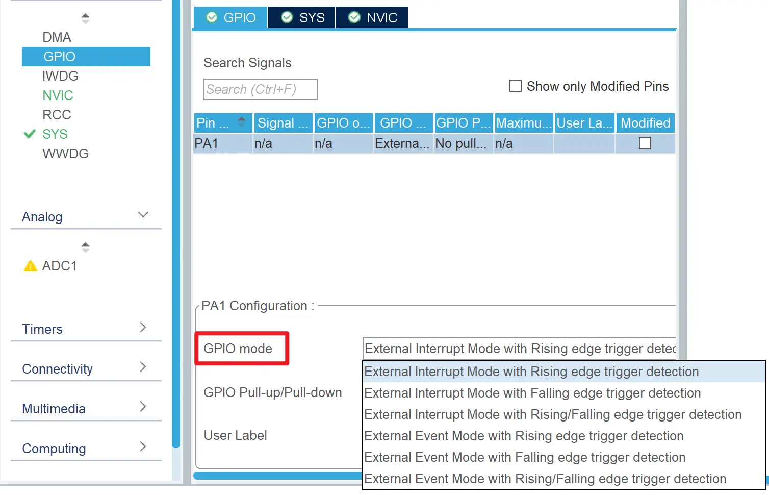 - 设置引脚为 GPIO_EXITx (中断或事件)模式