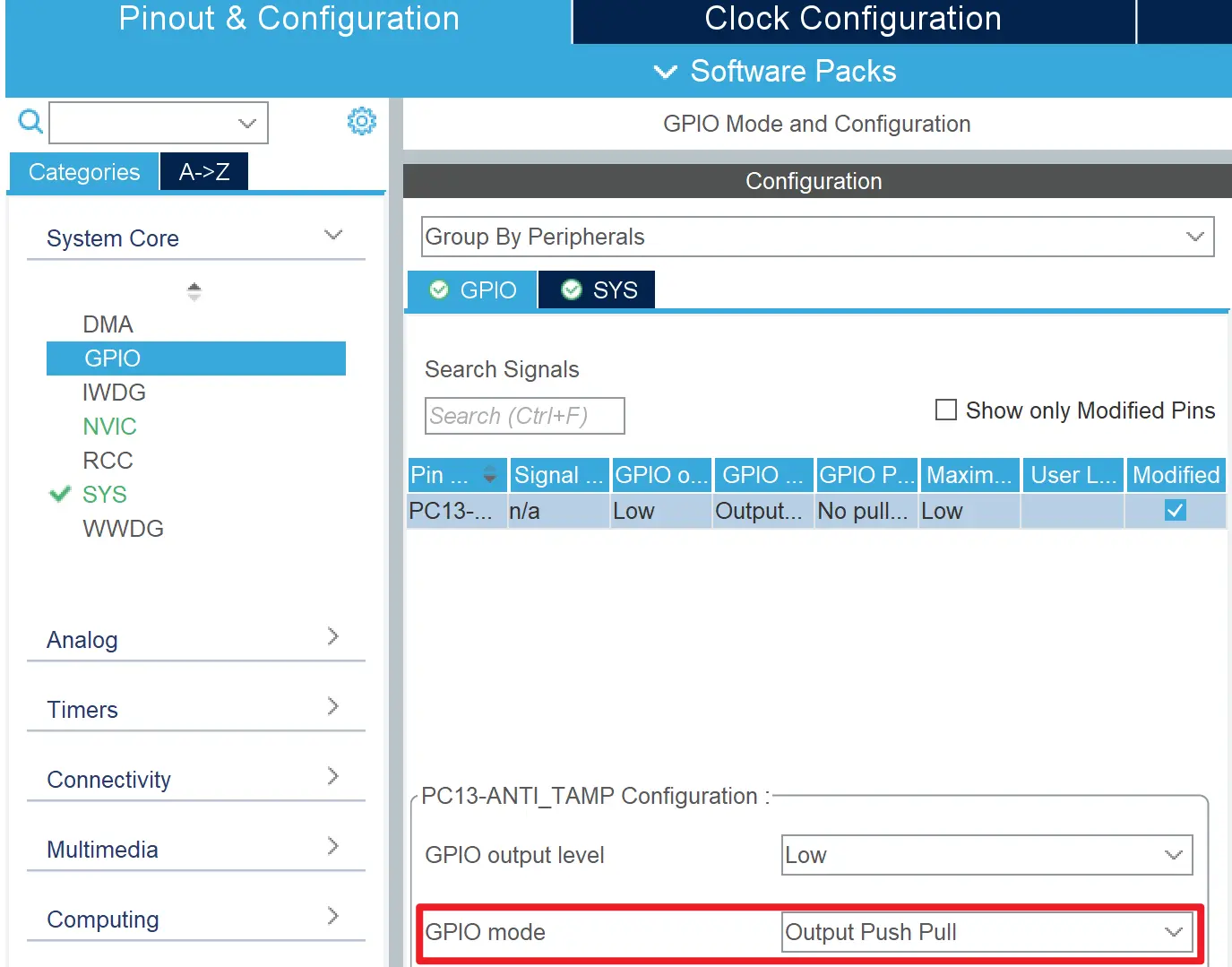 - 在 「GPIO」 页面下,选择对应引脚,将 「GPIO mode」 设置为 「Output Push Pull」