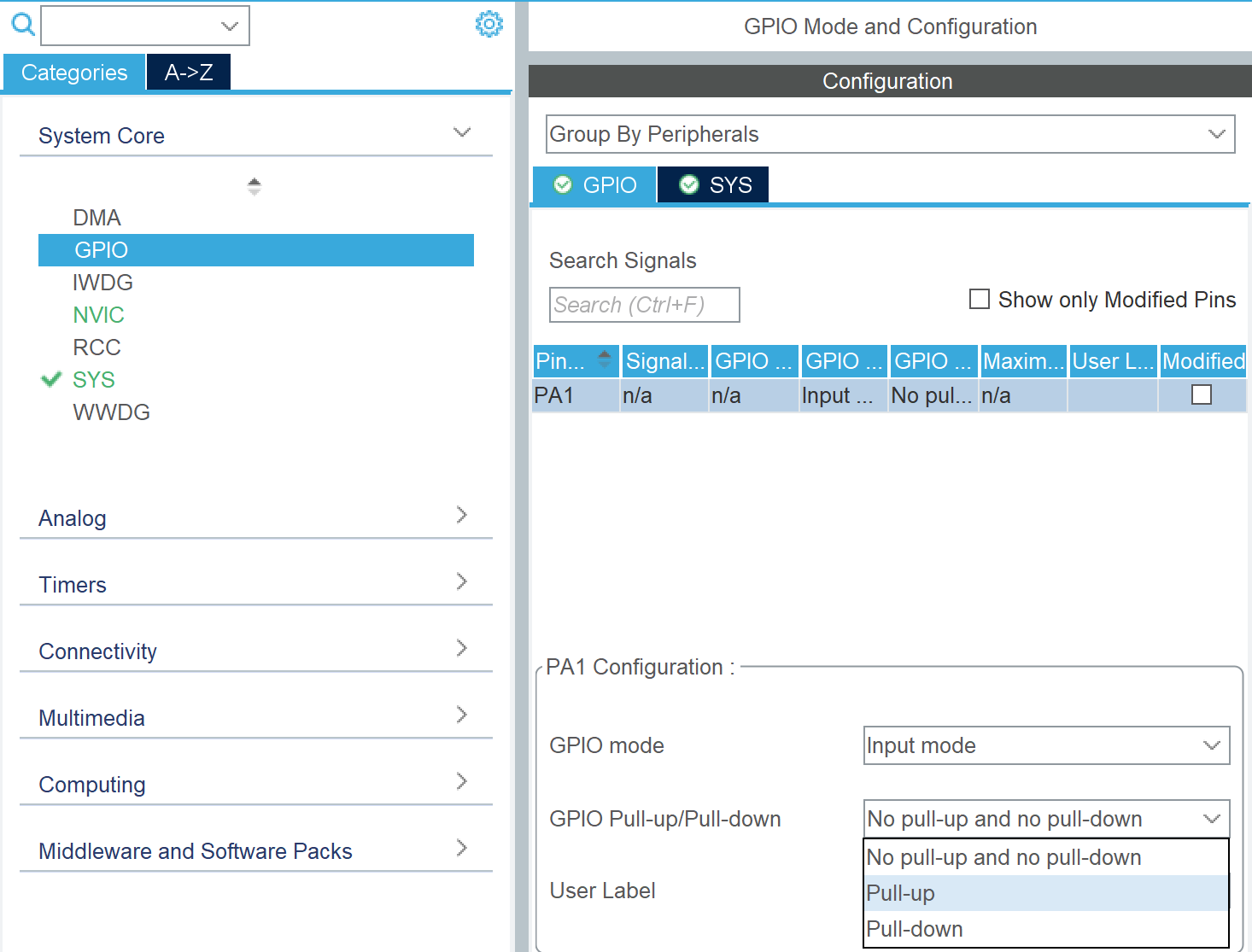 在 「GPIO」 页面下,选择对应引脚,将 「GPIO Pull-up/Pull-down」 设置为 「Pull Up」 或 「Pull Down」